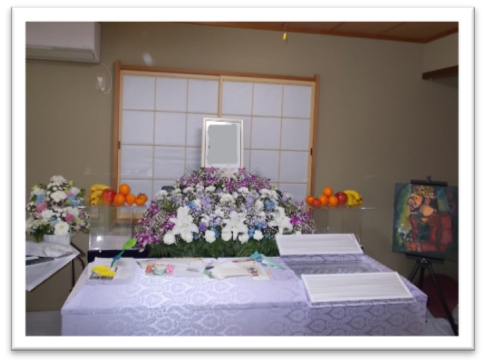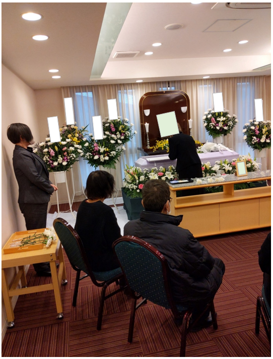 マンション集会所を利用した無宗教葬ですが、二日間かけてお別れの時間をとりました、会葬者12名。