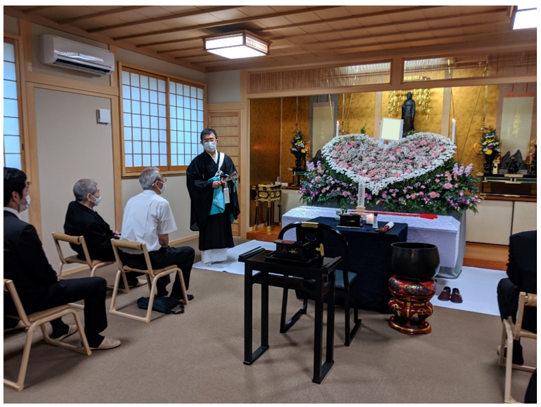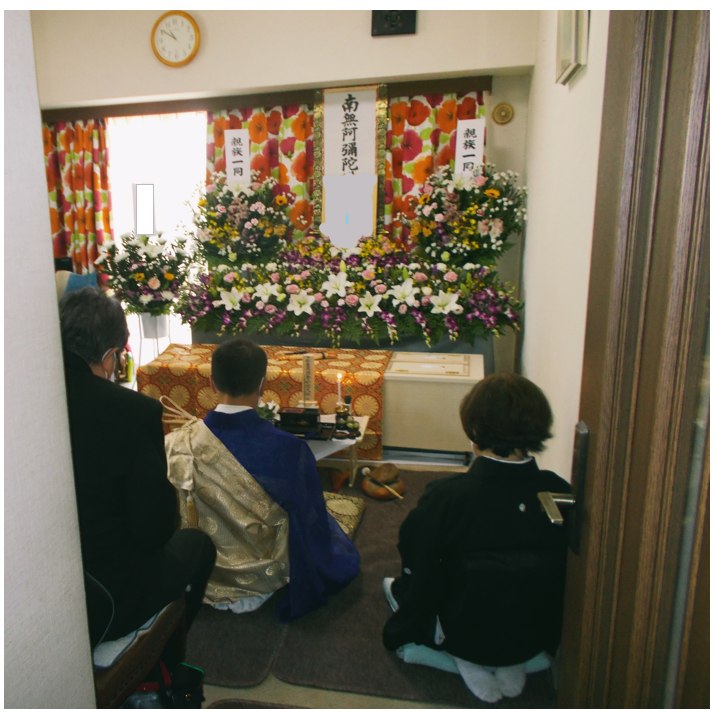 自宅葬・仏式、洋間で菩提寺住職を招いてのお別れ、会葬者8名。