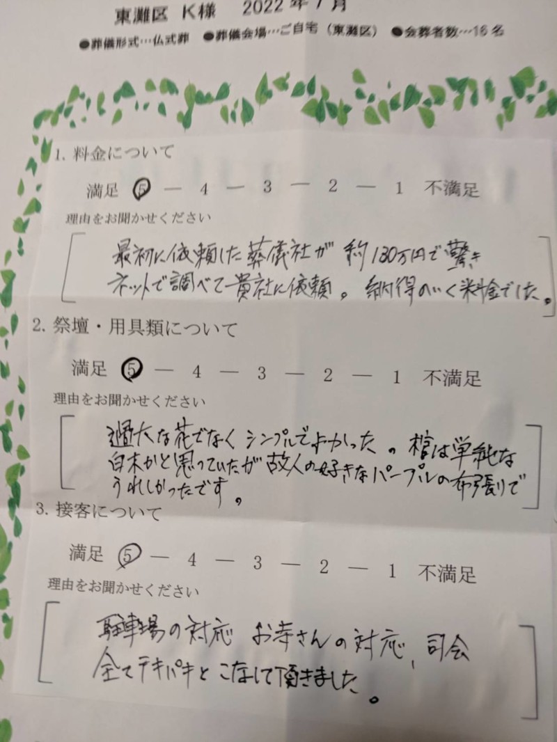 既に近くの葬儀社に連絡し、自宅に安置してもらったが、見積もり金額があまりにも高く感じたので、親族数名でネット検索し、セレモニーきずなにたどり着きました。納得価格で葬儀が出来ました。